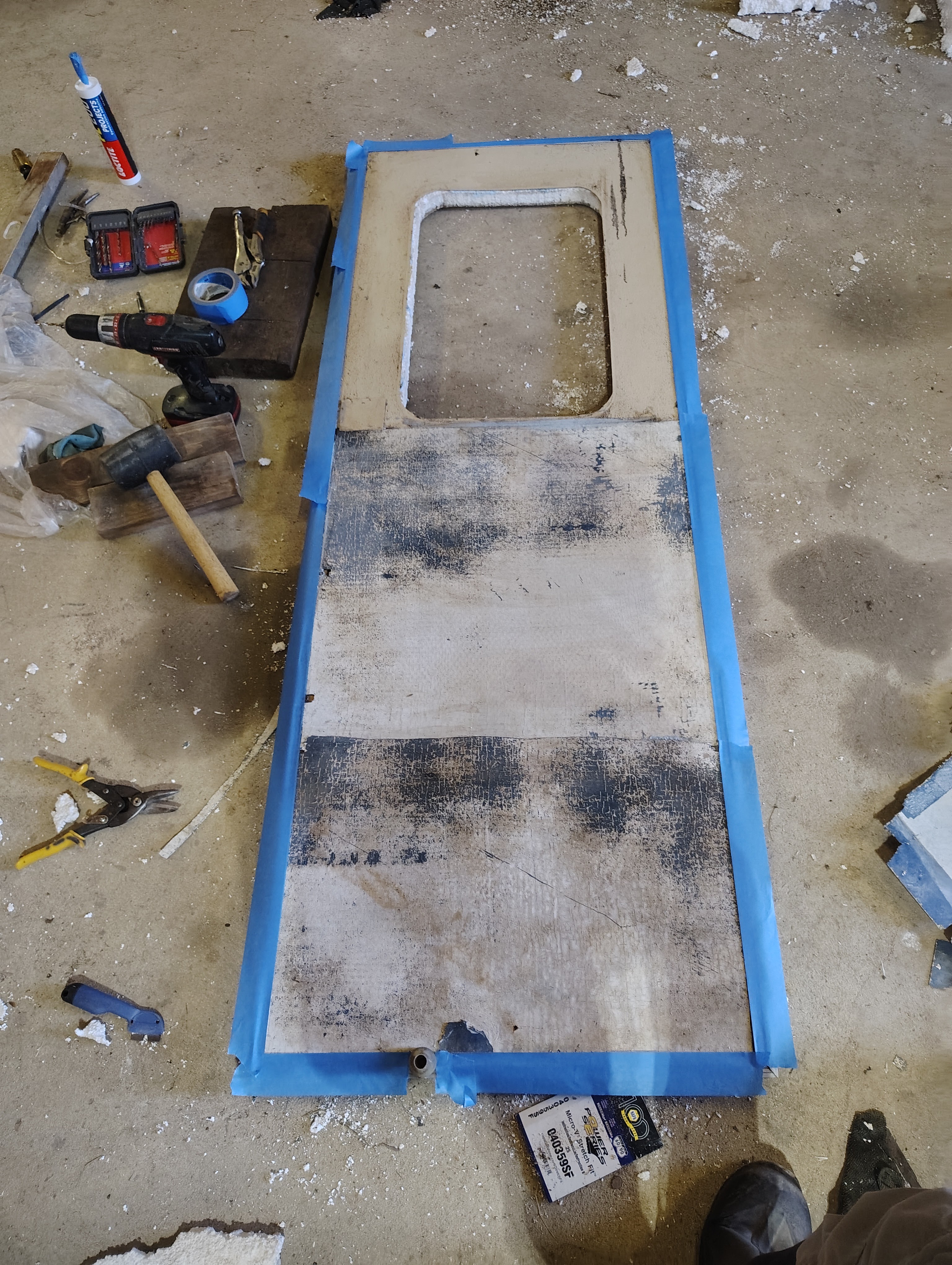 The door was two inches wider than the frame, oops. As it turned those man doors on that old camper were in fact not the same size. So I was left with no choice but to pull the trim off one side of the door and cut everything down by two inches: the outer panel, the insulation, the top and bottom frame pieces, and the inside panel. Even after all that, the door still closed a little tight. Not to worry, I shaved it down a bit in a very precise manner using an angle grinder.