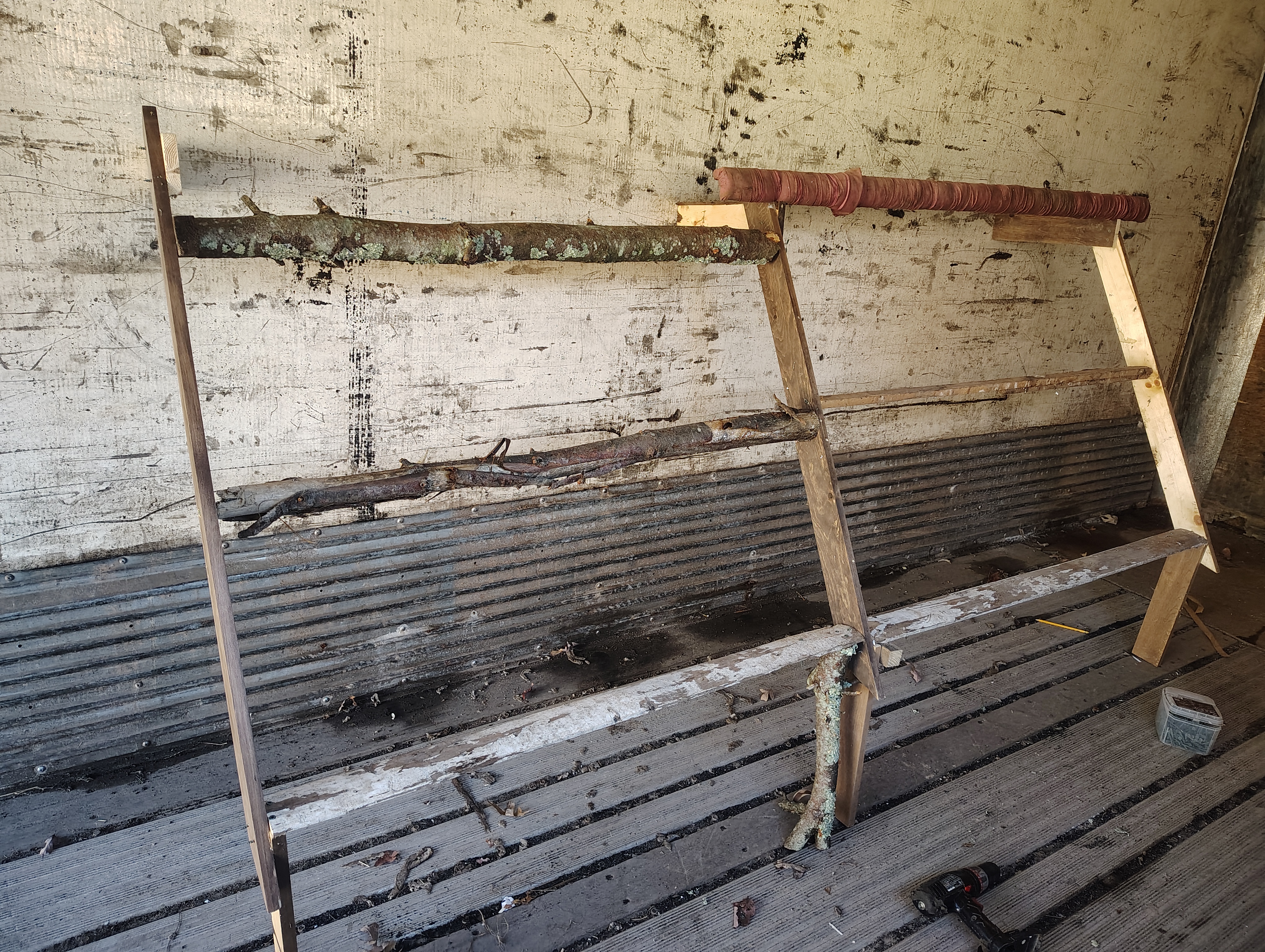 By this time, my chicks were starting to look a lot like chickens, and the pressure to move them was building. I had, and still have, lots of things left to do, but I had to choose what was necessary to finish. After googling some tutorials, I turned my attention to crafting a set of roosts. Again, wanting to save some cash, I use mostly scrap materials we had lying around. This time I had a mix of 1x4s, 1x2s, and fence panels. When all that ran out, I finished with fallen branches found in the woods. The farmer is nothing if not ingenuitive, or cheap, depending on who you ask. Making sure to space my roosting bars at least 12 inches apart horizontally and vertically, I built a sizable set of ladder-style roosts in short order. Spacer legs were affixed to the bottom and back of the roosts to keep the whole thing adequately spaced from the floor and wall.