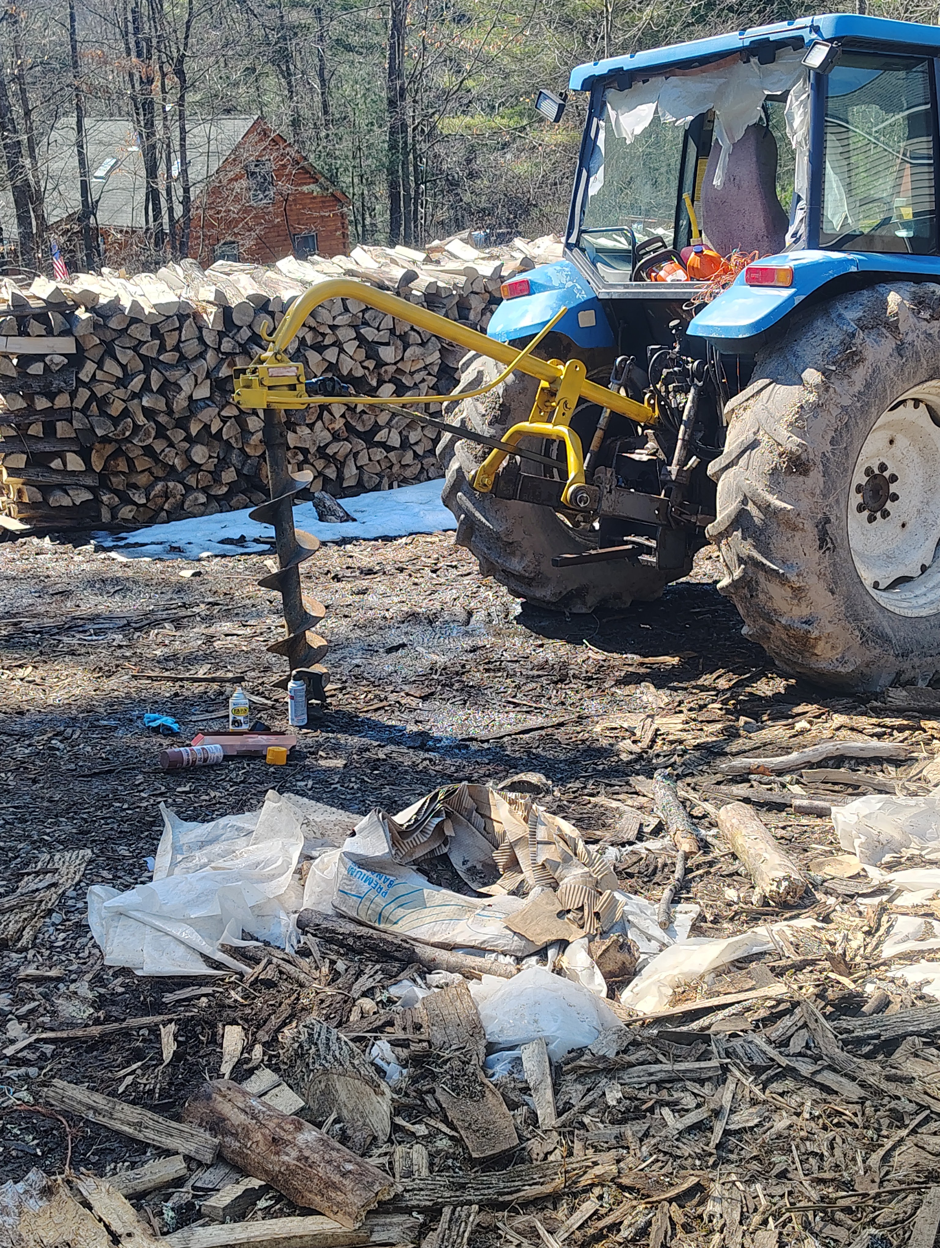 Back on the farm, we hooked up the digger and took it for a spin, no pun intended. The digger turned nice and quiet when hooked up to the PTO on our New Holland. I double-checked the oil in the gearbox, wire brushed and painted the digger, and we were almost ready to go. But, and there’s always a but, there was a complication. The digger came with the 10″ bit installed, and we had to swap it with the larger bit. There was one pin and one bolt holding the current bit to the shaft on the gearbox. In theory, you remove both of those, and the bit should fall off. It did not fall off. We hammered, we pried, we insulted its mother, but the bit wouldn’t budge. No amount of penetrating oil could persuade the thing to move. We even tried augering a couple of holes with all the pins removed, no luck.