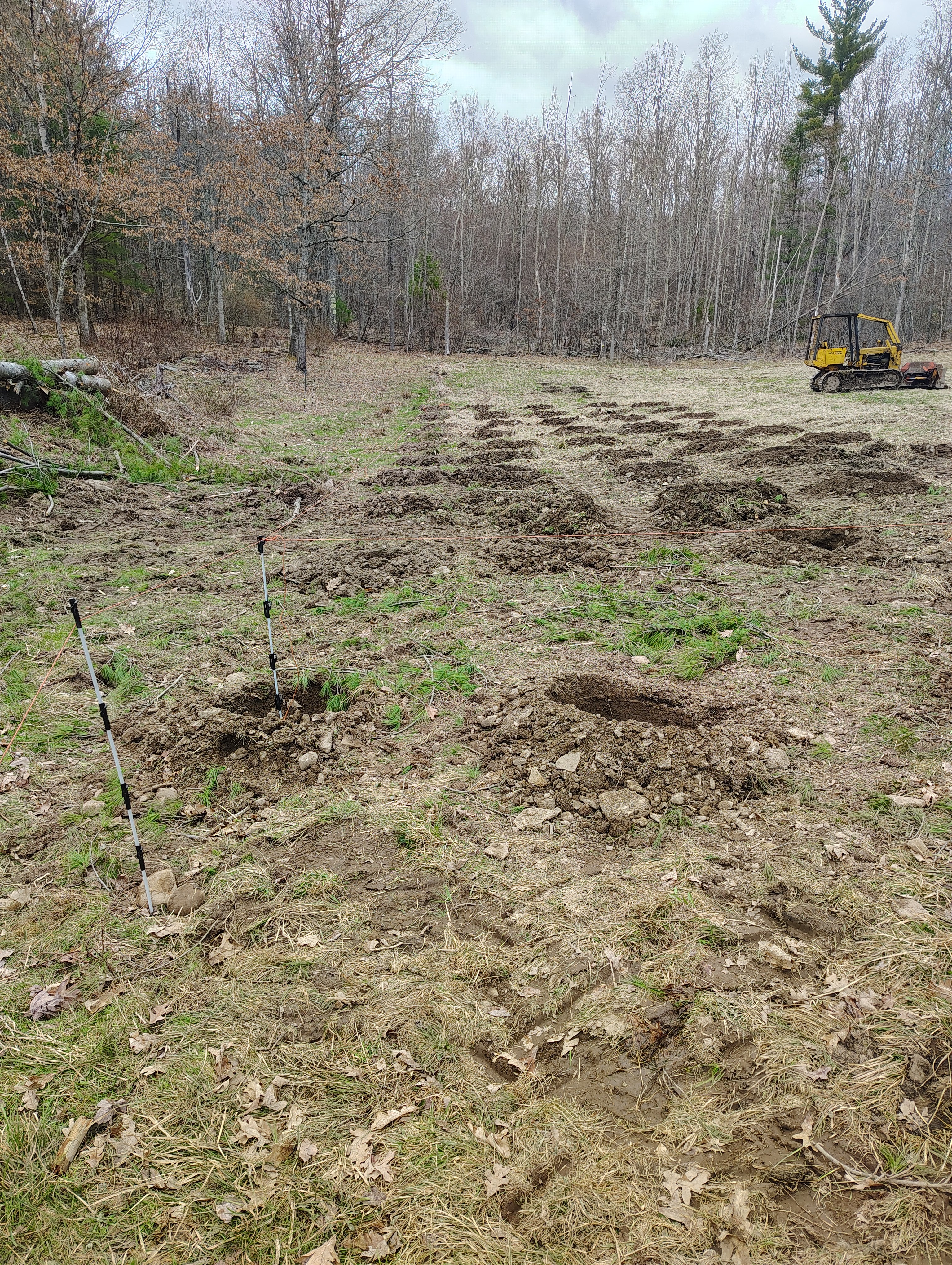Dad cleared all the current open space on the farm himself over the past 15+ years, so he has all the relevant experience. The tree was on the ground and pushed out of the way in impressively short time. The next step was to mark out the holes. After consulting the forum lords, I had decided to space my bushes 6′ apart within a row, and 10′ apart between rows. Like the rest of the property, the field was on an incline. Because of this, we made our rows going across the hill instead of along it, to help prevent soil erosion when it rains. We used a 100′ measuring tape and whatever sticks we could find to measure out and mark the hole locations.