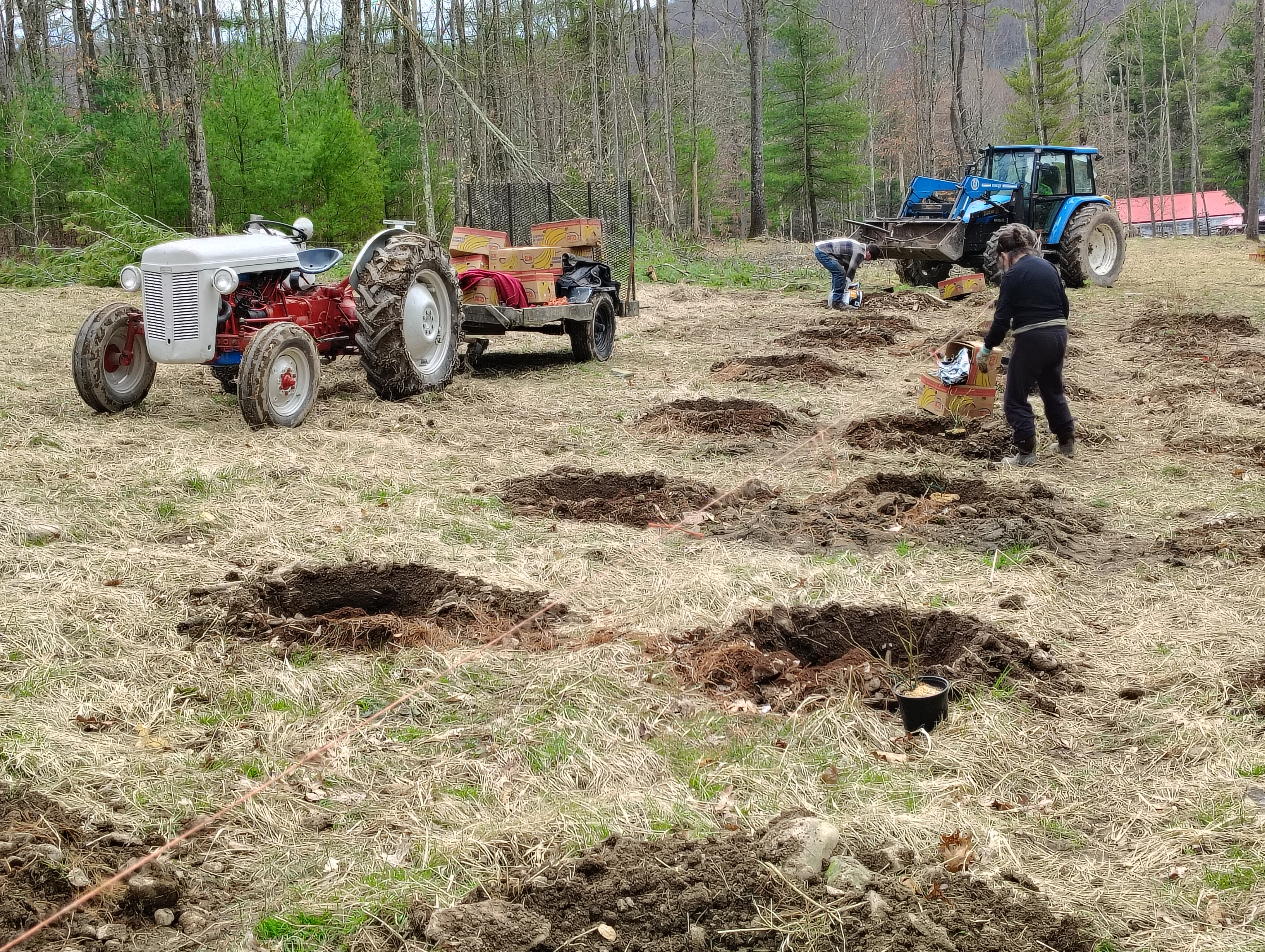 Dave arrived with my bushes sometime that afternoon. We loaded the bushes onto a small trailer and hauled them up to the field with our Ferguson T0-30. It was getting late by that point, but I wanted to at least get started on planting. For soil amendments, a mix of peat moss and organic matter was used in each hole to help with drainage. In particular, I used pine needles, leaves, and bark, all sourced from the farm. Initially, I tried to alternate between layers of organic matter, peat moss, and native soil. At some point, I got a little less picky about it and just tried to get the hole filled in. It seemed to shake out about the same either way. Funnily enough, the deposed dirt around each hole never seemed to be quite enough to fill the hole back in on its own.