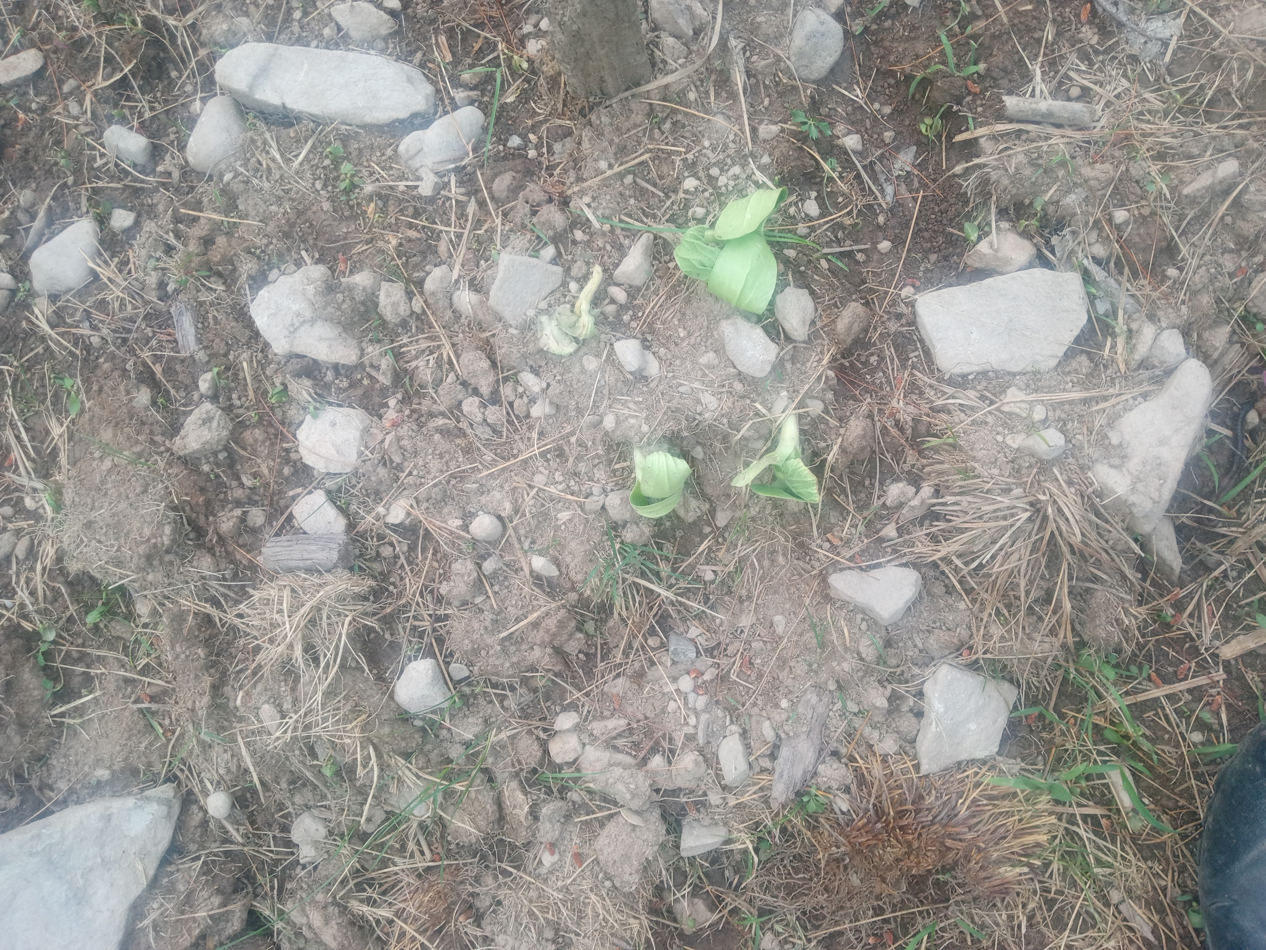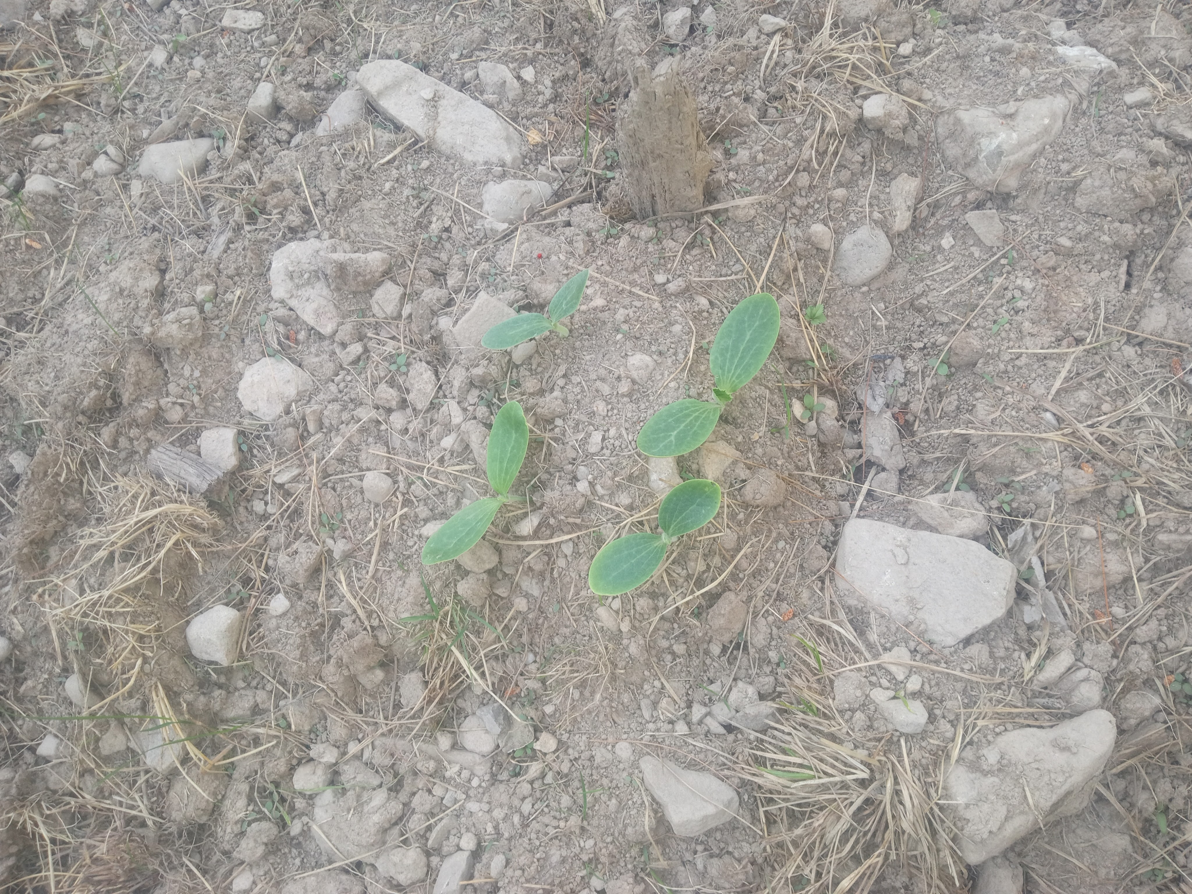 Between my father and me, we got all the pumpkin hills watered a few times during the heat wave. This might have been enough if the soil had been better prepared, but the lack of fine soil meant poor retention. The water tended to run right through the clumpy hills, sometimes taking the seeds with it.