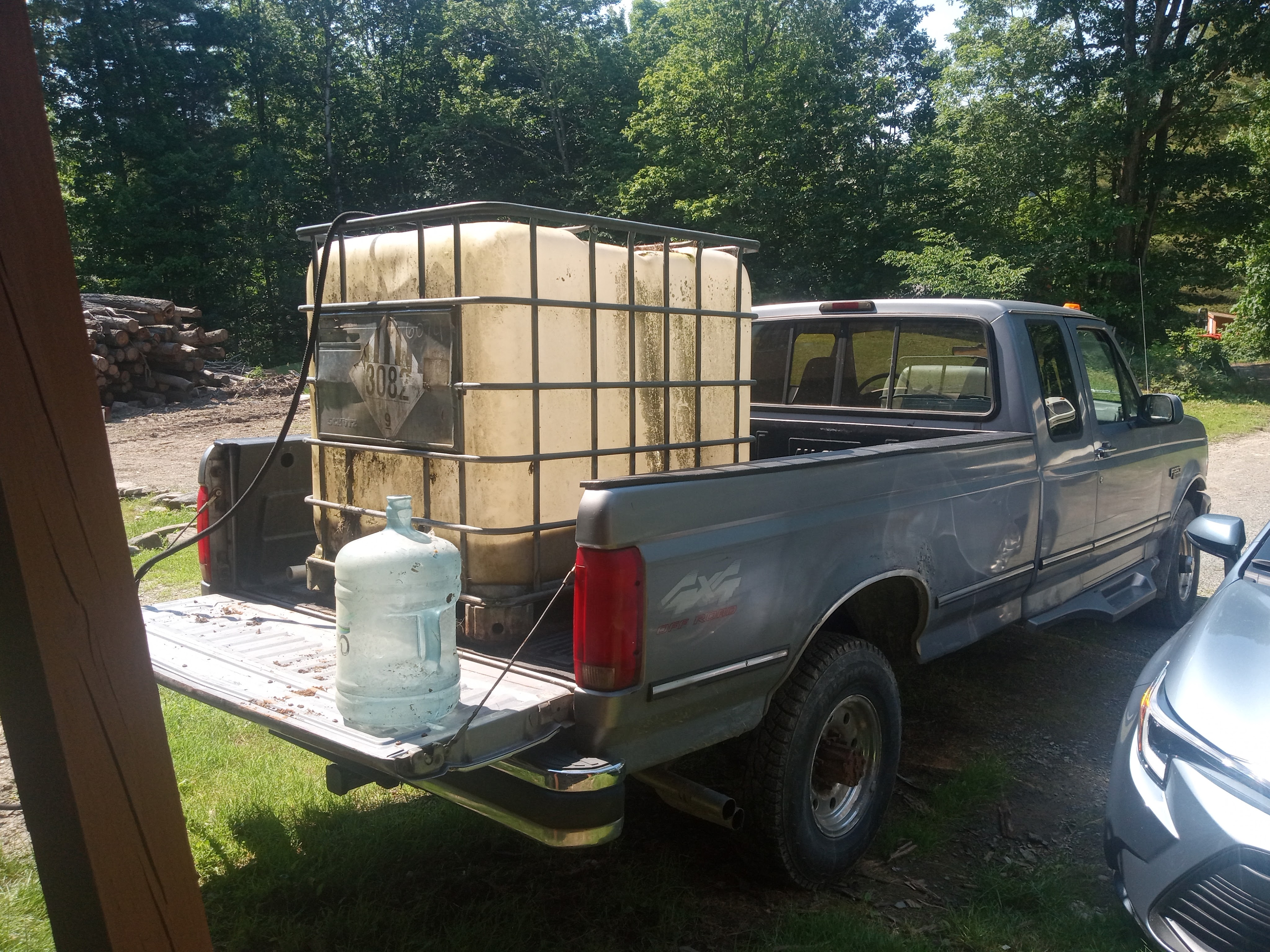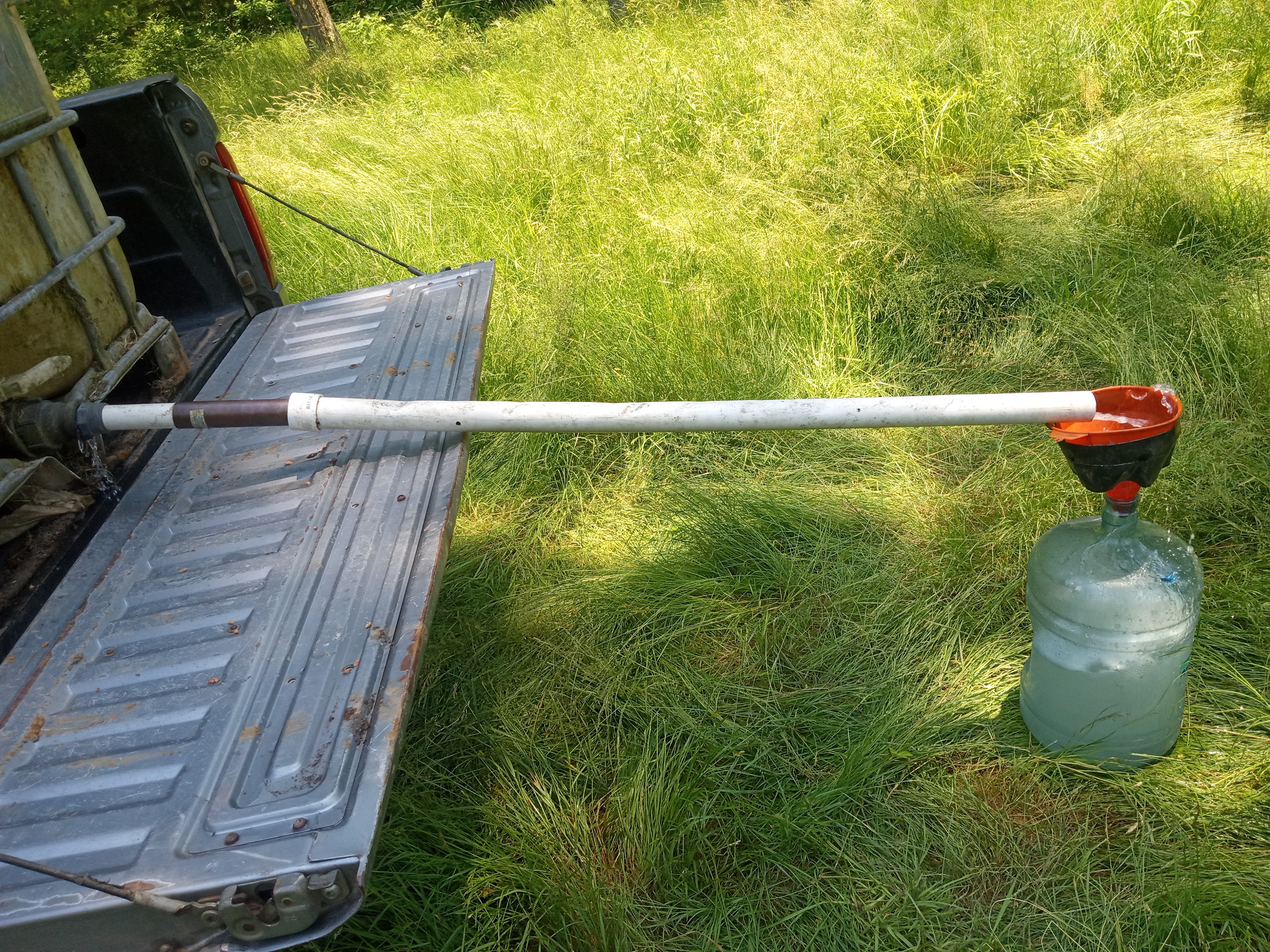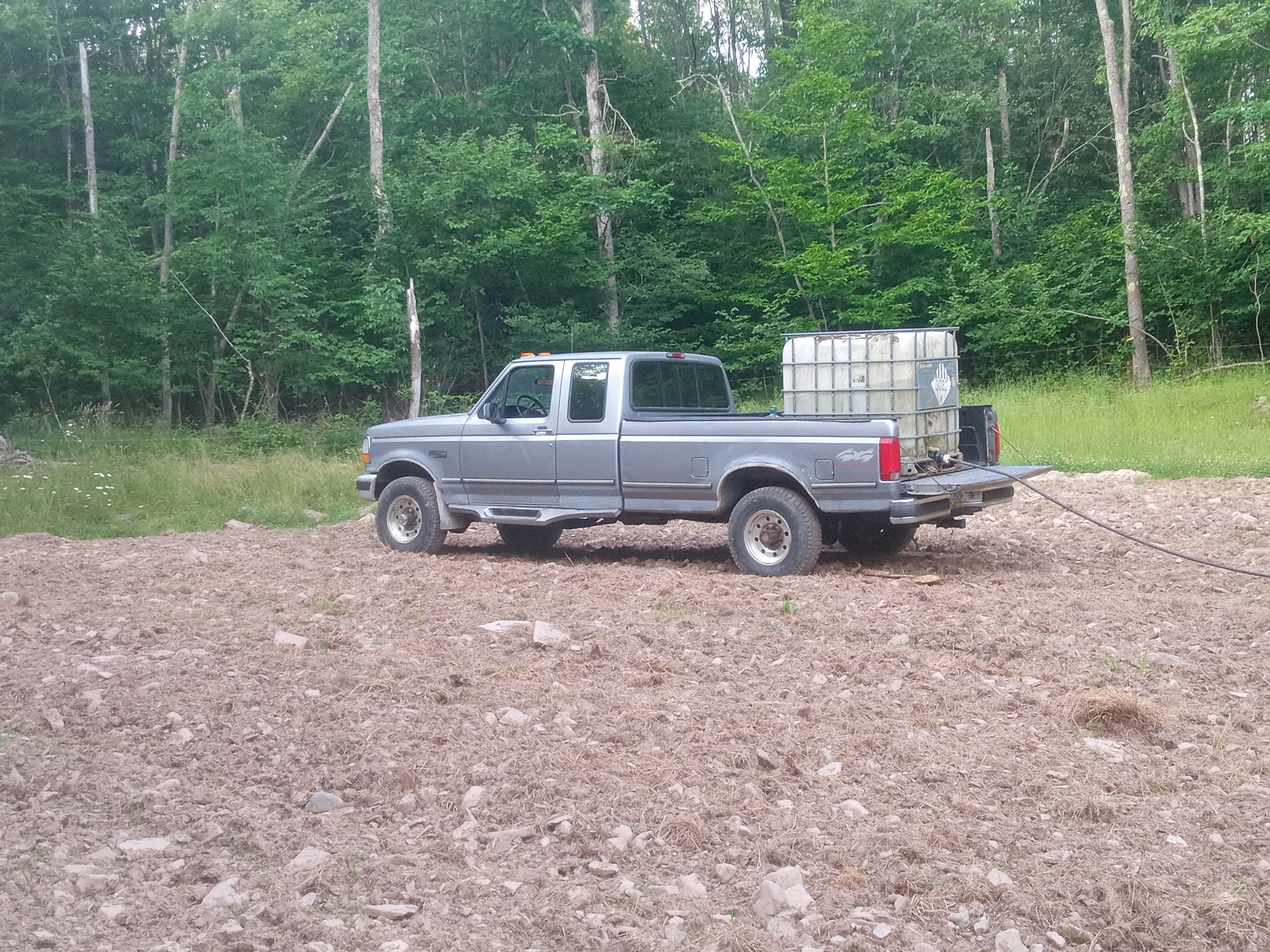 My optimism may have panned out, but then it never rained. Okay, maybe never is an exaggeration, though it sure felt like it that first month. Initially, we got a rain or two, and almost every hill had sprouts after a week. Then came a heat wave. It was 80+ with little to no rain for the rest of June, and I was unprepared. My sprouts quickly began wilting with only the morning dew to provide moisture. In a desperate bid to save them, I made my first attempt at irrigation. The fields were too far from the house to run a hose, but we had a 250-gallon IBC tote. I loaded it into the back of my F-250 and filled it from the pond with a small transfer pump.
