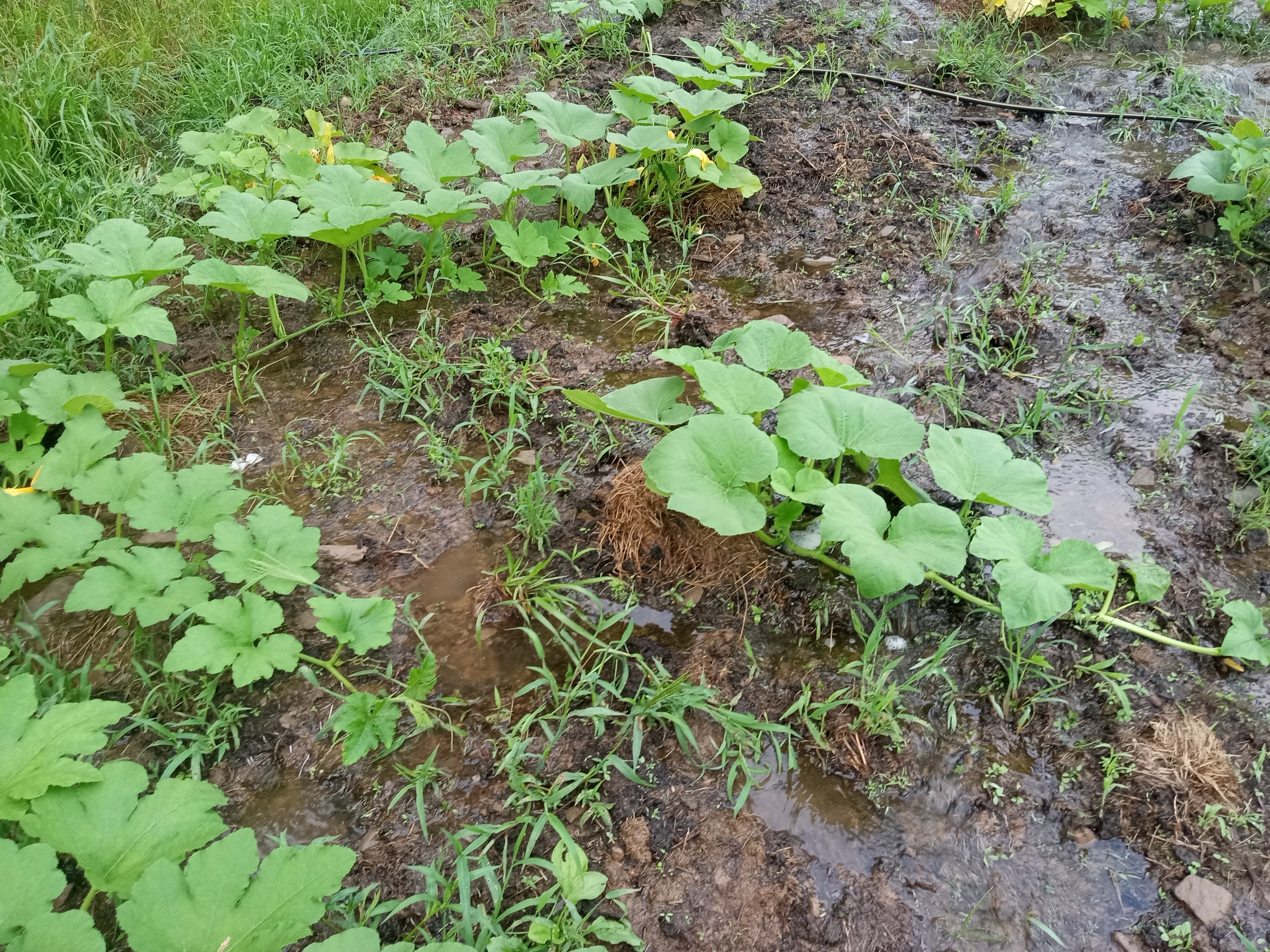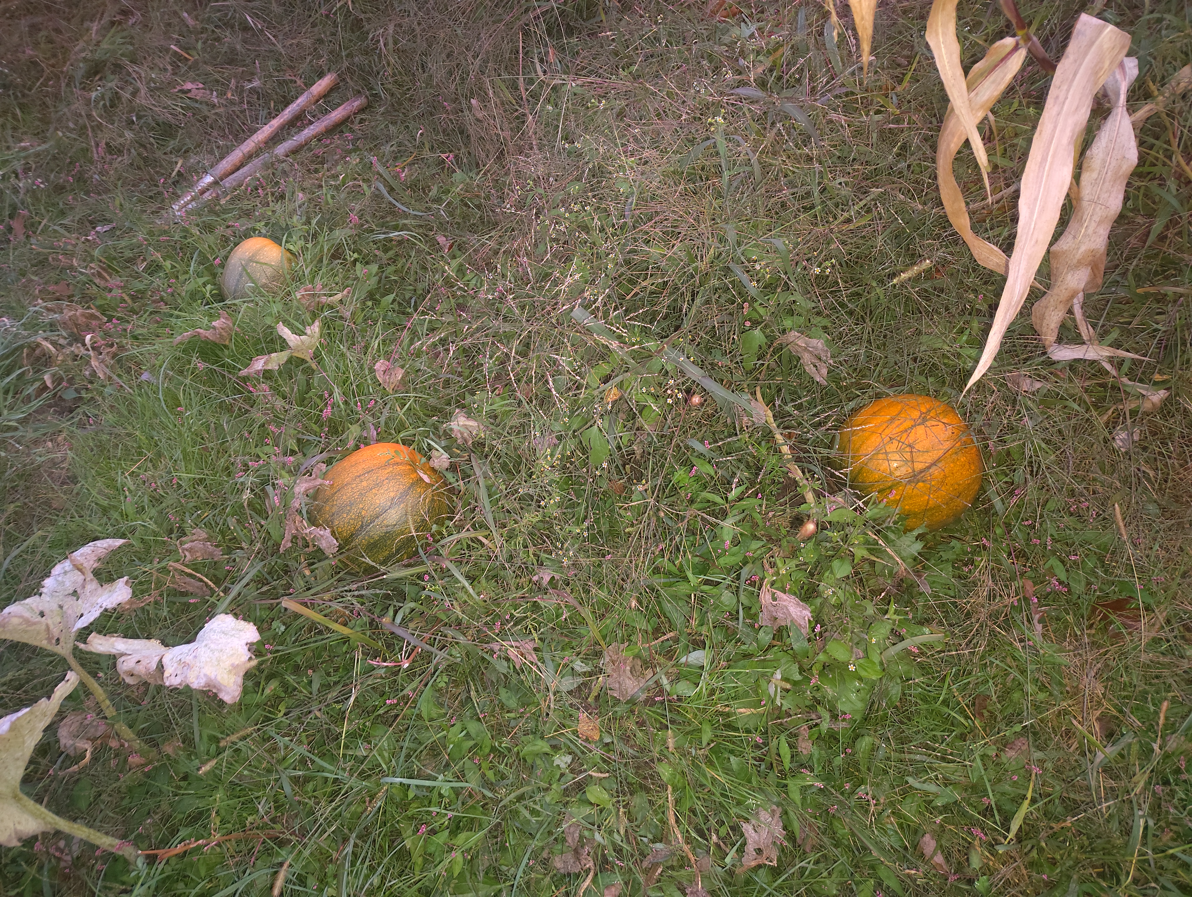 I planted around 20 hills or so this time around, a bit timid after my large patch failed. July was a little kinder weather-wise, and we got regular rain. The new plants made it past the sprout phase and soon grew shockingly long vines. My plants were behind other growers’, but I was still excited to be having some success. The vines developed flowers in August, and the beginnings of fruit soon followed. I irrigated with buckets for a time, then we got major rain that left rivers running through the field; that kept the field pretty wet the rest of the season. I got maybe half a dozen pumpkins that year, none very large. Some of them even failed to turn orange. I chalked this up to the plants having started too late and the cold coming too soon.
